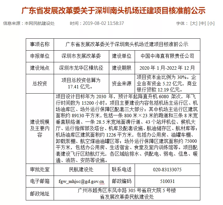 《關(guān)于深圳南頭機(jī)場遷建項目核準(zhǔn)前公示》。