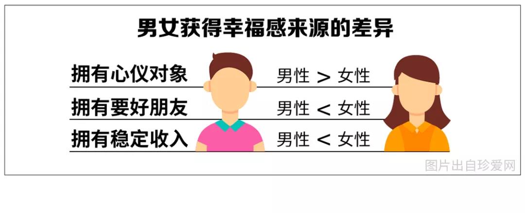 深入研究發(fā)現(xiàn),男性對“擁有心儀對象”的需求比例(6.67%)略高于女性(3.17%),女性則是在擁有要好朋友的比例(28.79%)上高于男性(6.67%),且因為穩(wěn)定收入感到幸福的女性比例(60%)比男性(53%)更高。可見,女性更容易從穩(wěn)定的收入中獲得幸福感。