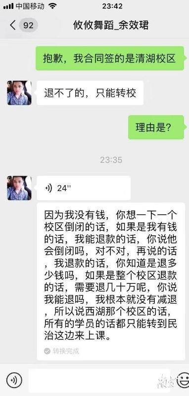 目前,學(xué)員們無(wú)法與余效珺保持穩(wěn)定聯(lián)系,但是8月7日與學(xué)員的溝通中,余效珺承認(rèn)清湖校區(qū)需退的學(xué)費(fèi)約有幾十萬(wàn),他無(wú)力退還,只能建議學(xué)員轉(zhuǎn)到民治校區(qū)上課。