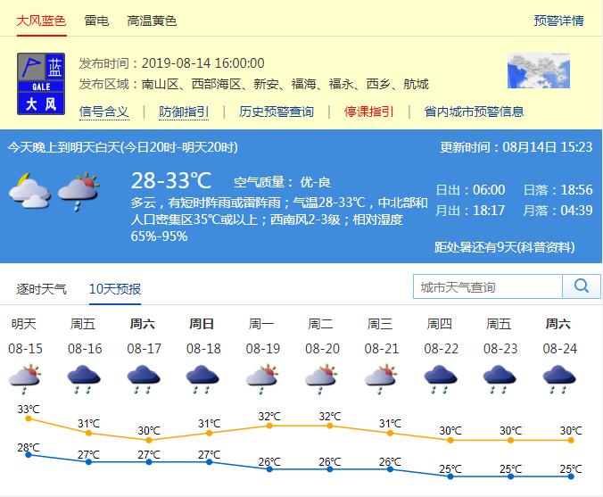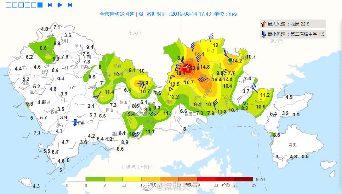 風(fēng)力逐漸減弱,深圳市氣象臺于2019年08月14日17時15分在南山區(qū),西部海區(qū)和寶安區(qū)(新安、福海、福永、西鄉(xiāng)、航城街道)取消大風(fēng)藍(lán)色預(yù)警。