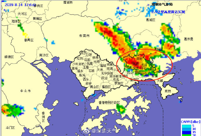 預(yù)計坪山區(qū)和龍崗區(qū)(坪地、寶龍、龍崗、龍城街道)1小時內(nèi)將出現(xiàn)30毫米左右降水,深圳市氣象臺于2019年08月14日17時05分在坪山區(qū)和龍崗區(qū)(坪地、寶龍、龍崗、龍城街道)發(fā)布暴雨黃色分區(qū)預(yù)警,全市進(jìn)入暴雨戒備狀態(tài),請注意防范。