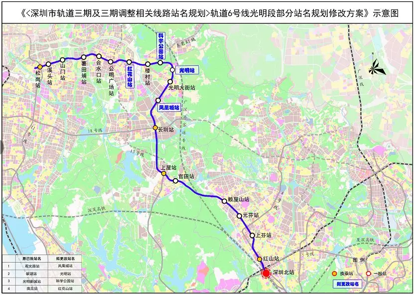 ▲軌道三期及三期調整相關線路站名規(guī)劃6號線光明段部分站名修改方案示意圖
