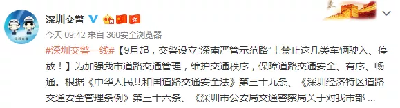 9月起,交警設(shè)立“深南嚴(yán)管示范路”!禁止這幾類(lèi)車(chē)輛駛?cè)搿⑼7拧?/p>