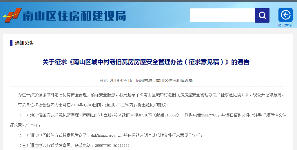 意見稿征集截止至9月30日,有關(guān)單位和社會各界人士有意見或建議的要及時進行反饋,更多情況可以登錄南山區(qū)住建局官網(wǎng)進行查看。
