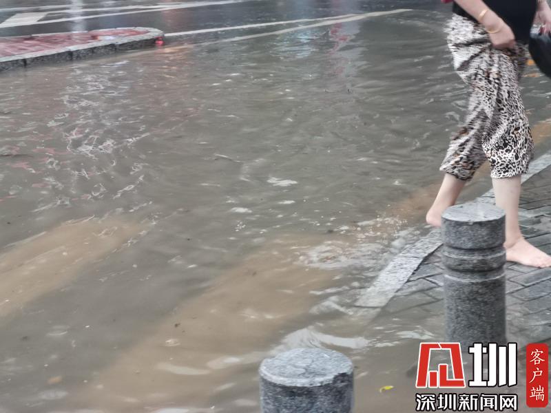 蓮花路景新花園公交站附近,車輛和行人涉水。