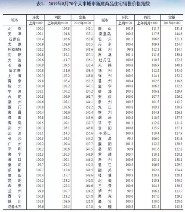 2019年8月份70個大中城市
