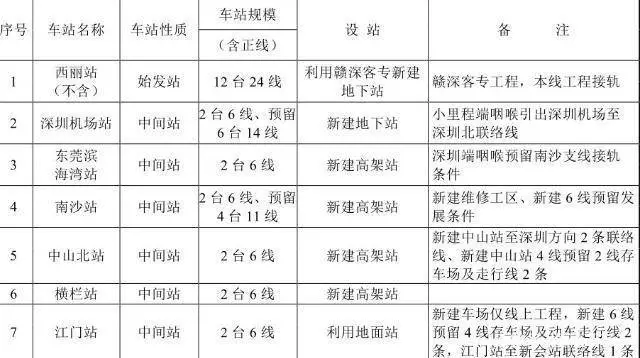 新建深茂鐵路深圳至江門段為高速鐵路,雙線。正線西麗至南沙段及深圳北至深圳機場聯(lián)絡線時速200公里,正線南沙至江門段時速250公里;新建設西麗、深圳機場、濱海灣、南沙、中山北、橫欄、江門共7座車站。