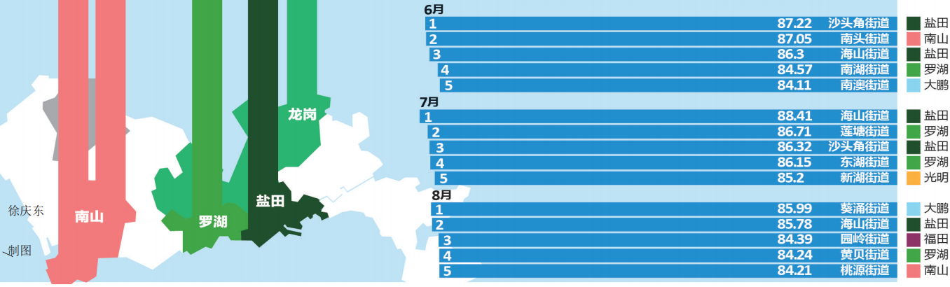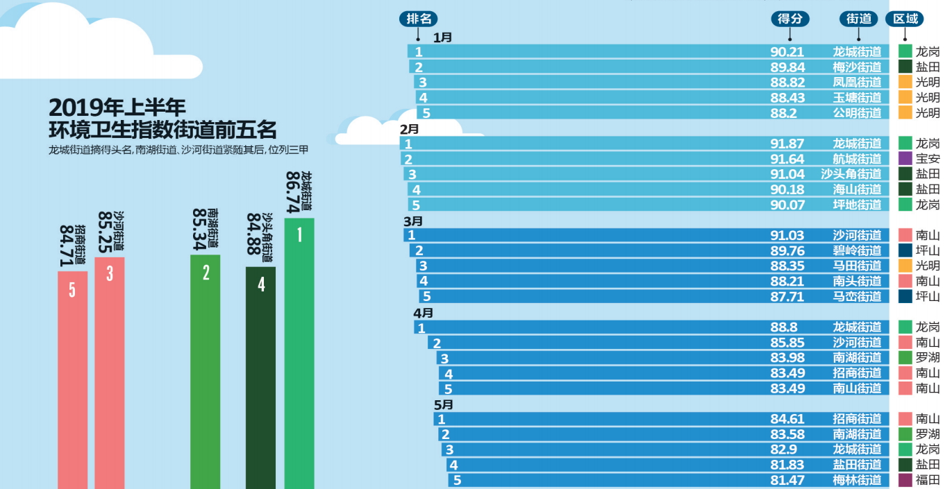 推進(jìn)環(huán)境質(zhì)量邁進(jìn)國際一流,深圳一直在行動。細(xì)心的市民可能早已發(fā)現(xiàn),深圳市城市管理和綜合執(zhí)法局官方網(wǎng)站每個月都會發(fā)布“深圳市環(huán)境衛(wèi)生指數(shù)排行榜”,為深圳的環(huán)境衛(wèi)生“打分”。據(jù)了解,深圳市環(huán)境衛(wèi)生指數(shù)測評排名已連續(xù)開展了兩年半,有效促進(jìn)了全市環(huán)境衛(wèi)生的提升和轉(zhuǎn)變。今年上半年的“成績單”顯示,全市各區(qū)(新區(qū))各街道你追我趕,測評工作帶動社區(qū)環(huán)境改善,環(huán)境衛(wèi)生的整治提升得到了市民的廣泛認(rèn)可和好評。