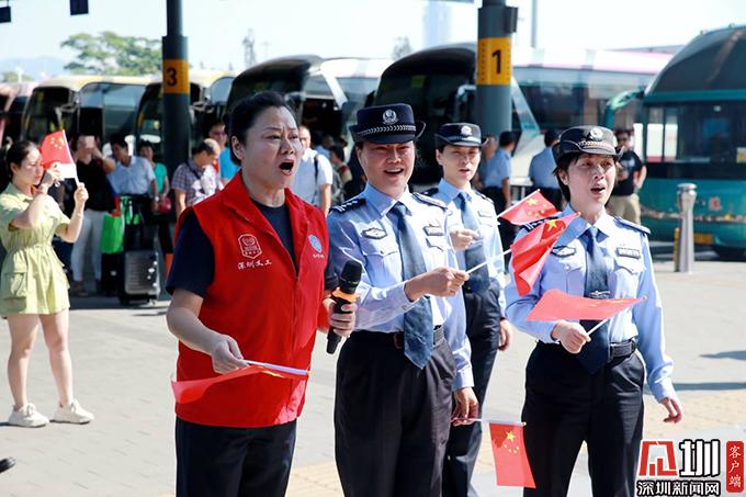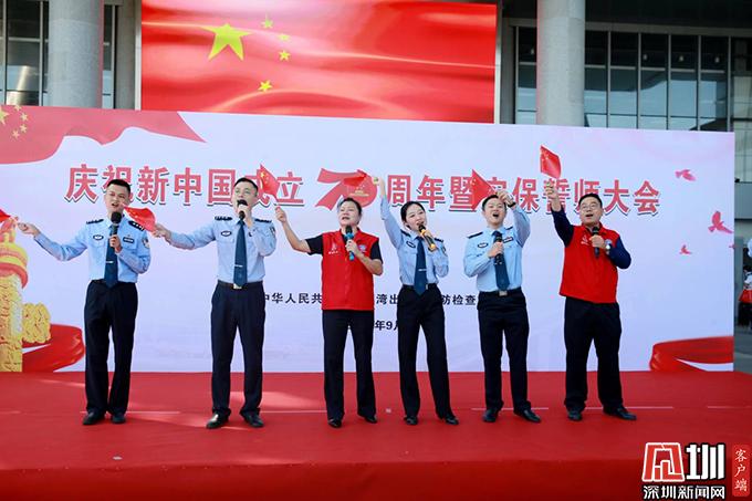 大會現(xiàn)場,一面巨幅國旗在12名邊檢民警的護衛(wèi)下,在會場正中位置迎風拂動;國旗兩側(cè),由深圳灣邊檢站民警、地方公安民警、駐地武警官兵、口岸輔警及口岸U站志愿者組成的方陣依次排列。