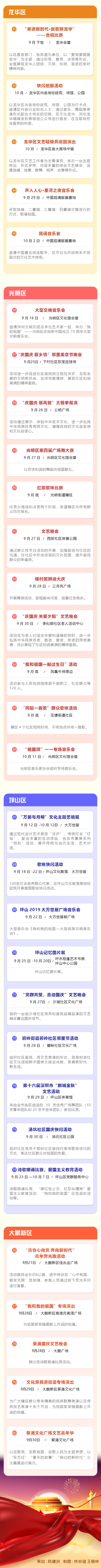 為慶祝中華人民共和國(guó)成立70周年,深圳市將舉辦專場(chǎng)音樂會(huì)、群眾文藝晚會(huì)、焰火晚會(huì)等活動(dòng),同時(shí)將舉行10場(chǎng)“愛我中華——南粵百園慶國(guó)慶”主題游園及80場(chǎng)“我和我的祖國(guó)”國(guó)慶群眾文藝嘉年華活動(dòng)。主題游園和文藝嘉年華活動(dòng)安排如下: