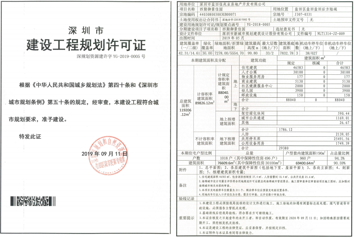 公告顯示,深圳市鹽田佳兆業(yè)房地產(chǎn)開發(fā)有限公司的四期御景佳園項(xiàng)目(鹽田三、四村和西山嚇村整體搬遷項(xiàng)目5號地塊),位于鹽田區(qū)鹽田港后方陸域J307-0331號宗地,用地面積18514.16平方米,允許建設(shè)總建筑面積88040平方米,其中住宅46583平方米、人才公寓30100平方米。本期住宅1018戶,其中保障性住房496戶。