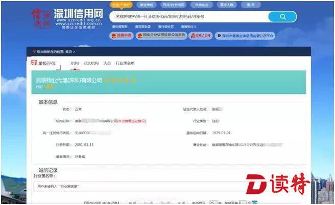 用戶登錄“深圳信用網(wǎng)”,只需根據(jù)頁面指示搜索相關(guān)鍵字,查詢頁面即可查到房地產(chǎn)中介機(jī)構(gòu)的注冊(cè)備案地址、注冊(cè)時(shí)間、星級(jí)評(píng)價(jià)以及誠信記錄等信息。