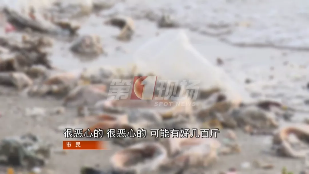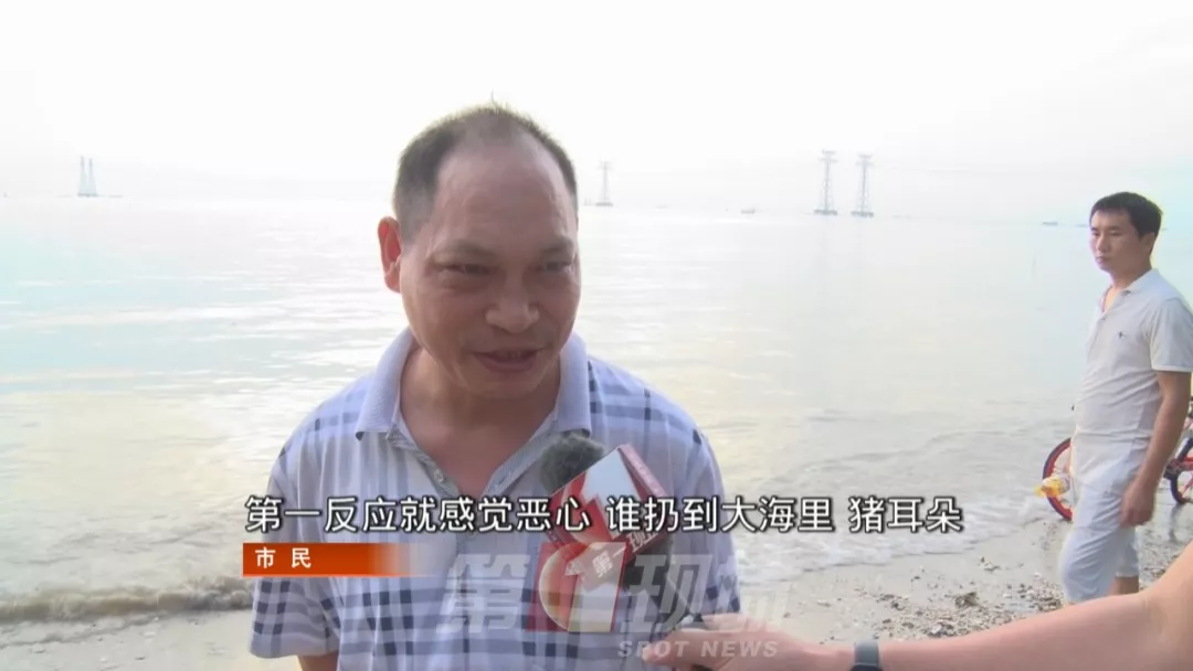 在寶安區(qū)金灣大道旁的休閑海灘,緊挨著西灣濱海公園,風(fēng)景不錯(cuò)。不過(guò),沿著沙灘南行300米,卻出現(xiàn)和景色完全不符,十分倒胃口的場(chǎng)景,沙灘上遍布著成片的豬耳朵。