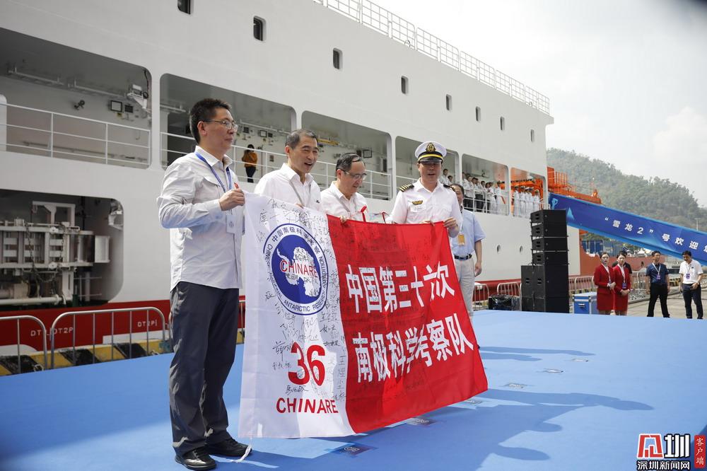 當(dāng)天下午,近百名市民、學(xué)生及各市直部門(mén)和中央駐深涉海部門(mén)代表看到“雪龍2”號(hào)船靠泊碼頭,發(fā)出熱烈的歡呼聲,他們揮舞著手中的紅旗熱烈歡迎“雪龍2”號(hào)科考船及國(guó)家第36次南極考察隊(duì)抵達(dá)深圳。當(dāng)船舶靠穩(wěn)并架設(shè)好舷梯后,深圳市政府副市長(zhǎng)、黨組成員黃敏等領(lǐng)導(dǎo)攜兩位少先隊(duì)員迎接考察隊(duì)代表,并獻(xiàn)花握手致意,表達(dá)誠(chéng)摯的歡迎和衷心的祝福。