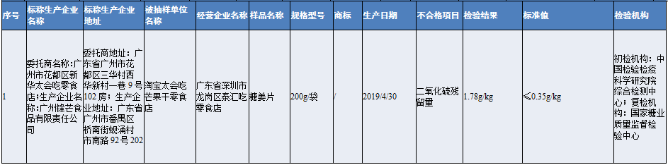 其中,深圳市龍崗區(qū)泰匯吃零食店經營的淘寶店銷售的糖姜片,被檢出二氧化硫殘留量不符合食品安全國家標準規(guī)定,存在食品添加劑超限量使用的問題。