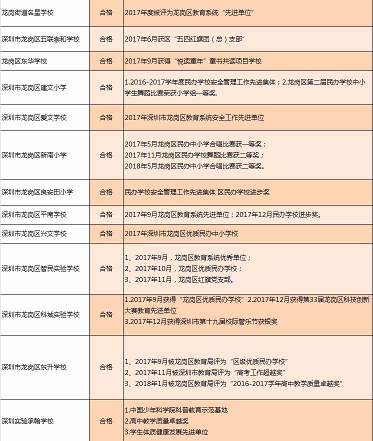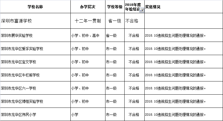 近日,深圳教育局在其官網(wǎng)發(fā)布深圳市民辦中小學辦學情況信息公告。最新公告顯示:2018年度年檢結(jié)論為“不合格”的學校共有8所,“基本合格”的有12所,其他均為“合格”或“不滿一年未年檢”。其中,不合格的8所學校分別為:深圳市富源學校、深圳市展華實驗學校、深圳市龍華區(qū)愛孚實驗學校、深圳市龍華區(qū)寶文學校、深圳市龍華區(qū)牛欄前學校、深圳市龍華區(qū)六一學校、深圳市龍華區(qū)博恒實驗學校和深圳市龍華區(qū)偉民小學。主要涉及違規(guī)招生問題。