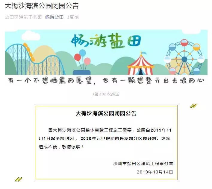 另外,大梅沙海濱公園管理處2019年10月12日發(fā)布公告稱:因大梅沙海濱公園重建需要,公園配套停車場(chǎng)封閉施工,暫停車輛停放。