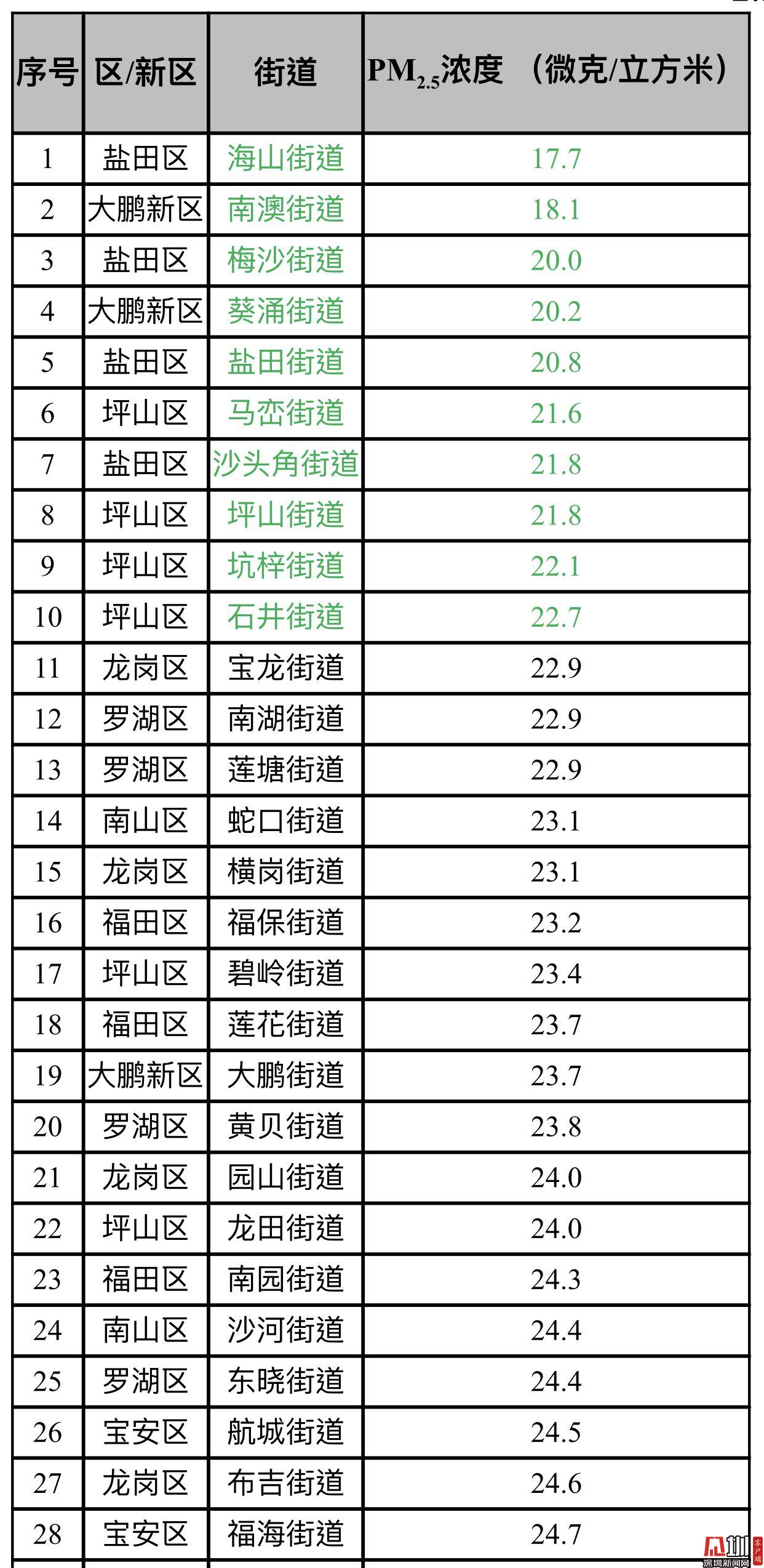 見(jiàn)圳客戶(hù)端·深圳新聞網(wǎng)2019年10月22日訊(見(jiàn)圳客戶(hù)端、深圳新聞網(wǎng)記者 陳婕)10月22日,記者從深圳市生態(tài)環(huán)境局了解到,2019年9月,全市74個(gè)街道PM2.5濃度在17.7-37.4微克/立方米之間,均值為26.1微克/立方米。排名前十的是海山、南澳、梅沙、葵涌、鹽田、馬巒、沙頭角、坪山、坑梓和石井等街道,排名倒數(shù)前十的為新湖、桃源、西鄉(xiāng)、福永、公明、大浪、馬田、觀(guān)瀾、福城和新安等街道。