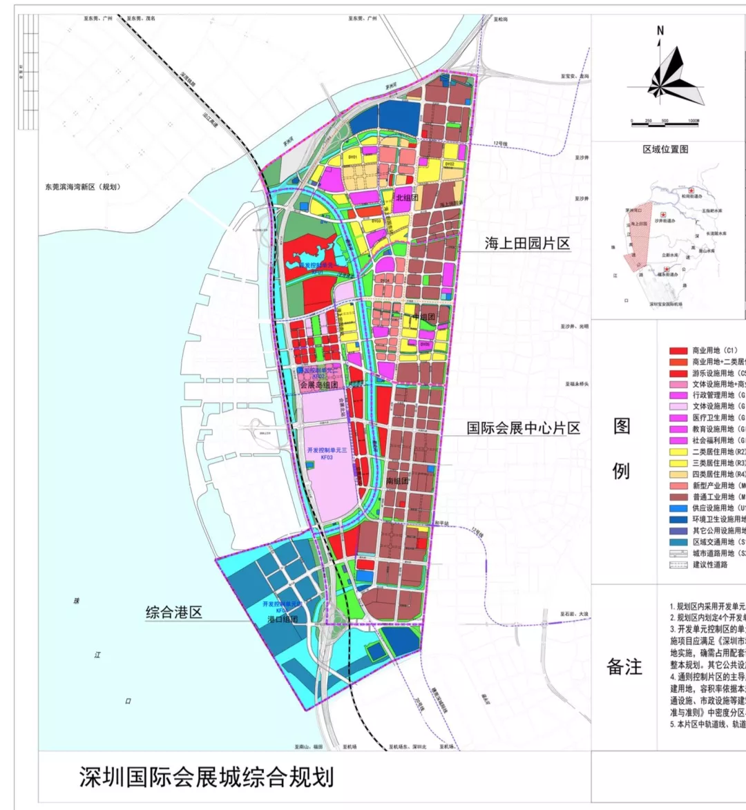 “深圳國際會展城”范圍北抵茅洲河、東至松福大道、南臨福永河、西側主要以廣深沿江高速公路為界,并包括規(guī)劃寶安綜合港區(qū),范圍共計22.57平方公里,規(guī)劃區(qū)劃分為三個片區(qū):國際會展中心片區(qū)、海上田園片區(qū)和寶安綜合港區(qū)。