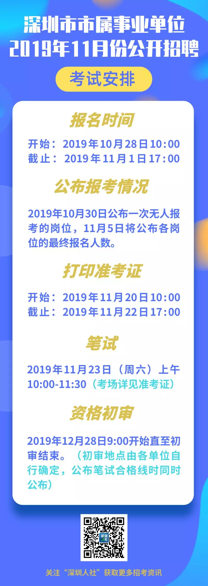 見(jiàn)圳客戶端·深圳新聞網(wǎng)2019年10月25日訊(見(jiàn)圳客戶端深圳新聞網(wǎng)記者 何暢)據(jù)“深圳人社”微信公眾號(hào)消息,深圳市市屬事業(yè)單位2019年11月份公開(kāi)招聘公告正式出爐。此次一共招聘管理和專(zhuān)業(yè)技術(shù)崗位工作人員122名,面向社會(huì)人員和應(yīng)屆生的崗位均有。