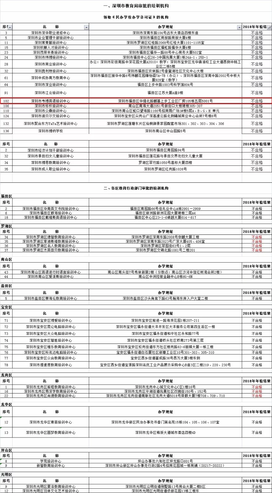 10月25日,深圳市教育局發(fā)布了《深圳市教育培訓(xùn)機構(gòu)年審信息公告》,為市民選擇培訓(xùn)機構(gòu)提供參考,其中有48家培訓(xùn)機構(gòu)2018年年檢結(jié)果被評定為不合格,其中韋博英語的名字赫然在列。
