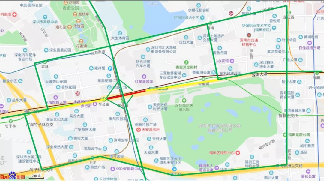 深南大道西往東方向過(guò)境車輛,建議通過(guò)廣深高速竹子林立交轉(zhuǎn)濱河大道或農(nóng)林路轉(zhuǎn)紅荔路繞行。深南大道東往西方向過(guò)境車輛,建議通過(guò)新洲路轉(zhuǎn)濱河大道,或新洲路、香梅路轉(zhuǎn)紅荔路繞行。