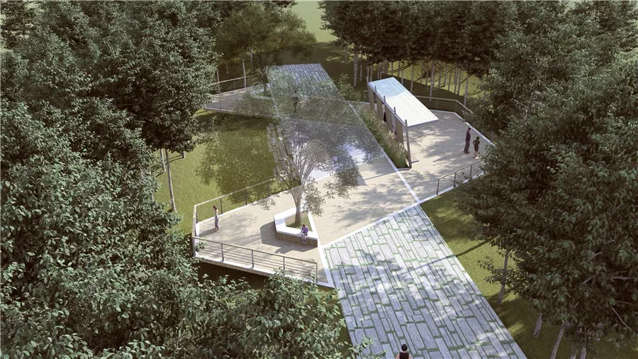 利用現(xiàn)狀平臺進(jìn)行改造提升,場地形式由“人”字演化而來,廊架也取自“人”形元素進(jìn)行設(shè)計(jì),平臺北向俯瞰群賢廣場,南面則朝向求知花園,具有一攬眾英才之意。