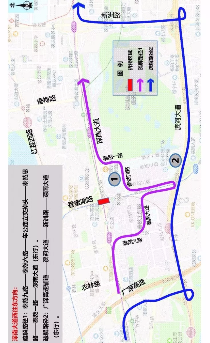疏解路徑1:泰然九路→泰然六路→車公廟立交掉頭→泰然思路→泰然一路→深南大道(東行)
