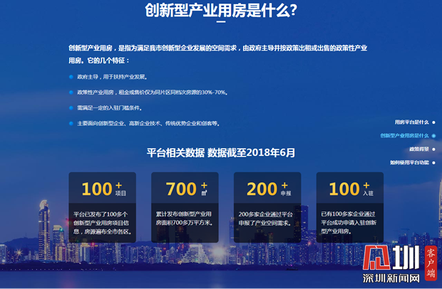 記者在平臺官網(wǎng)看到,平臺不僅提供創(chuàng)新型產(chǎn)業(yè)用房申請入口、平臺專享金融服務(wù)、企業(yè)空間需求申報,還設(shè)有深圳產(chǎn)業(yè)空間地圖、720度全景看房,頁面簡潔直觀。