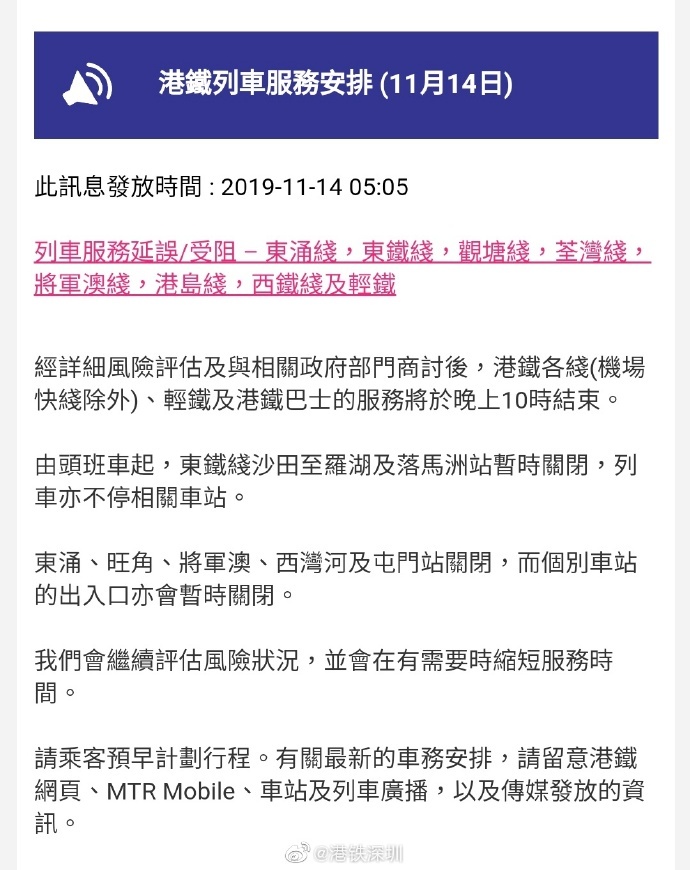據(jù)港鐵官網(wǎng)目前最新消息,11月14日,港鐵各線(機(jī)場快線除外)、輕鐵及港鐵巴士的服務(wù)將于晚上10時(shí)結(jié)束,東涌線、東鐵線、觀塘線、荃灣線、將軍澳線、港島線、西鐵線及輕鐵列車服務(wù)延誤/受阻。