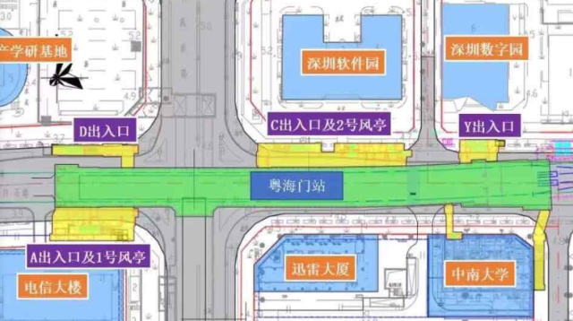 高新南站位于白石路上沿白石路東西向布置,車站出入口共計4個,其中A、B出入口接科技生態(tài)園,C出口靠豪威科技大廈,D出口通向科技南路方向。