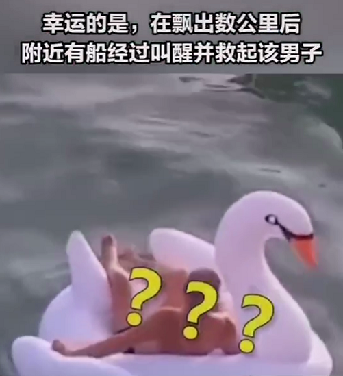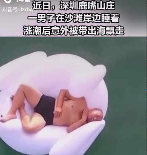最近,有個視頻很火。視頻中標(biāo)注:一男子在深圳鹿嘴山莊游玩時,躺在天鵝氣墊上睡著了,漲潮后被帶出海飄走,在飄出數(shù)公里后他被經(jīng)過的船叫醒并救起。