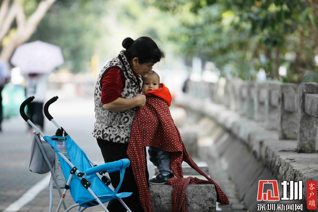 2019年11月19日,福田區(qū),冷空氣來襲,氣溫驟降,一位家長為孩子添衣。
