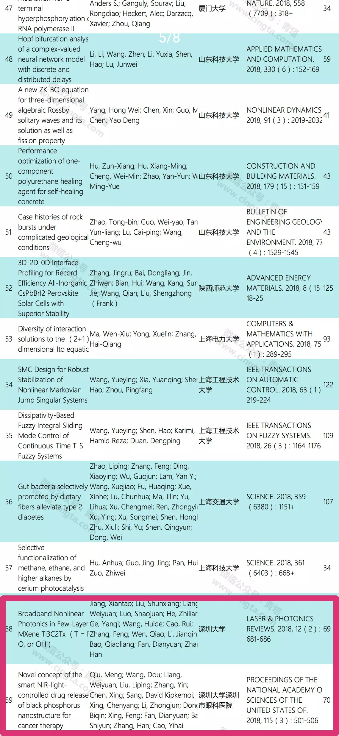 張晗教授課題組入選的2篇論文分別為《Broadband Nonlinear Photonics in Few-Layer MXene Ti3C2Tx (T = F, O, or OH)(新型智能近紅外光控黑磷納米結(jié)構(gòu)釋藥系統(tǒng)用于癌癥治療)》,所屬機(jī)構(gòu)為深圳大學(xué),來源期刊為《LASER & PHOTONICS REVIEWS.2018,12(2):681-686(美國(guó)科學(xué)院院刊)》,被引次數(shù)69;《Novel concept of the smart NIR-light-controlled drug release of black phosphorus nanostructure for cancer therapy(少層MXene納米片中的非線性光子學(xué))》,所屬機(jī)構(gòu)為深圳大學(xué)深圳市眼科醫(yī)院,來源期刊為《PROCEEDINGS OF THE NATIONAL ACADEMY OF SCIENCES OF THE UNITED STATES OF.2018,115(3):501-506(激光光子學(xué)評(píng)論)》,被引次數(shù)70。