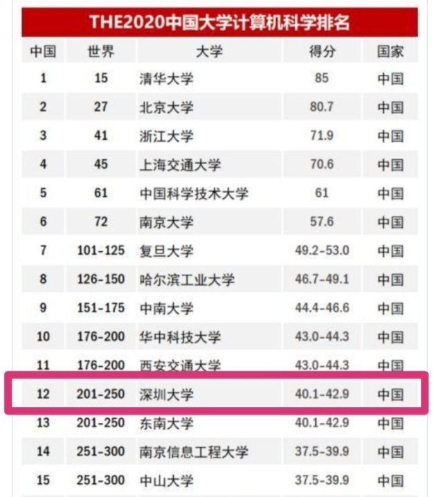 深圳商報2019年11月25日訊 近日,《泰晤士報高等教育》發(fā)布了世界大學(xué)學(xué)科的最新排名,對部分熱門專業(yè)進(jìn)行了排名更新。根據(jù)計算機(jī)科學(xué)專業(yè)最新排名顯示,深圳大學(xué)計算機(jī)科學(xué)學(xué)科位列中國內(nèi)地高校第12,較上一年度的泰晤士學(xué)科排名上升1位;世界排名從去年的301-400位進(jìn)階至201-250位之間。