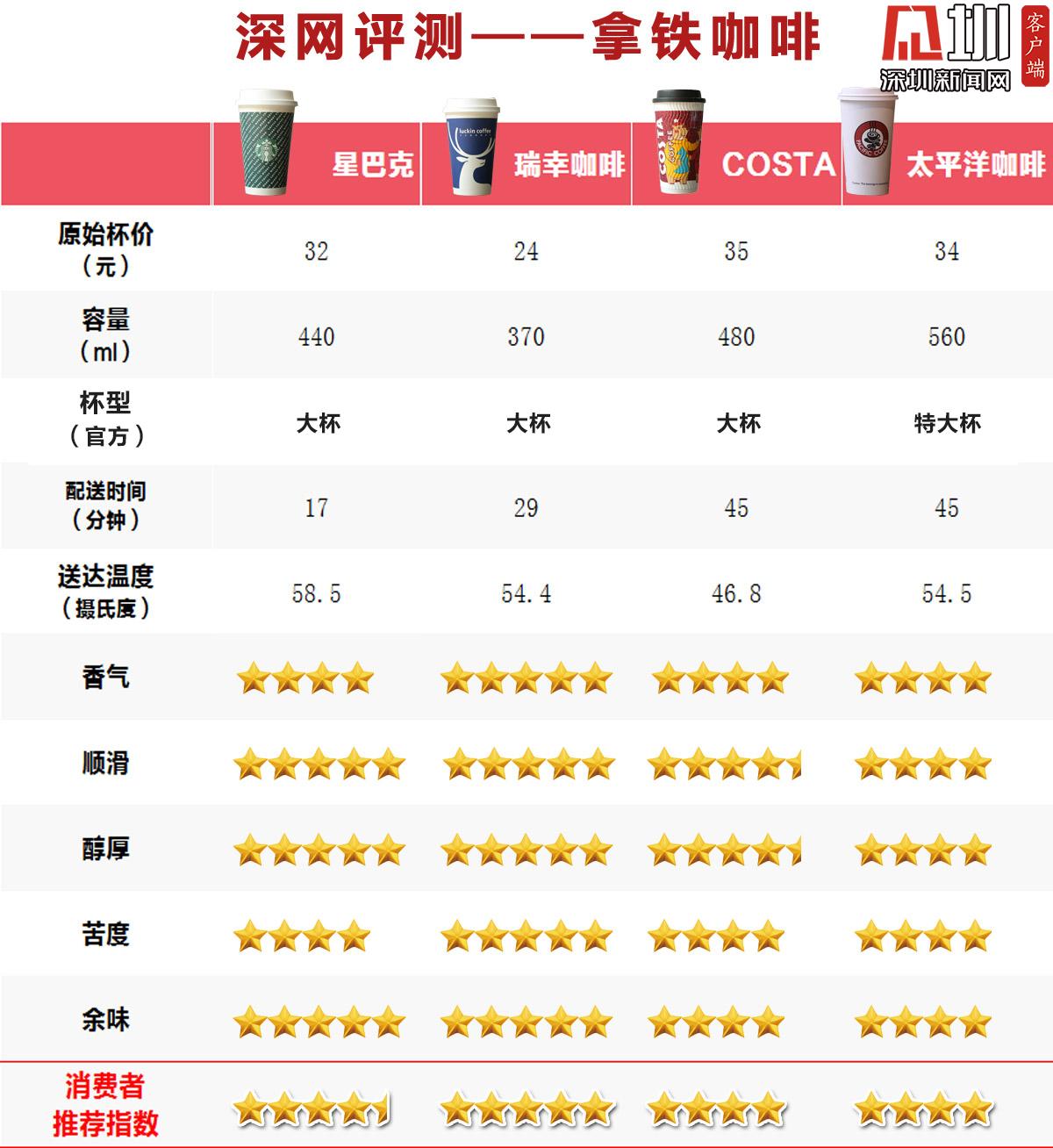 為了一探究竟,深圳新聞網(wǎng)測評小組聯(lián)合專注產(chǎn)品質(zhì)量、消費服務(wù)專業(yè)組織中國質(zhì)量萬里行,邀請了來自新聞、餐飲、IT以及其他行業(yè)的20位咖啡愛好者,對深圳市面上主流的星巴克、瑞幸、太平洋、COSTA 4個品牌,2種口味【“拿鐵(熱)”、“美式(熱)”】的咖啡,通過主觀+客觀的形式進行了測評。