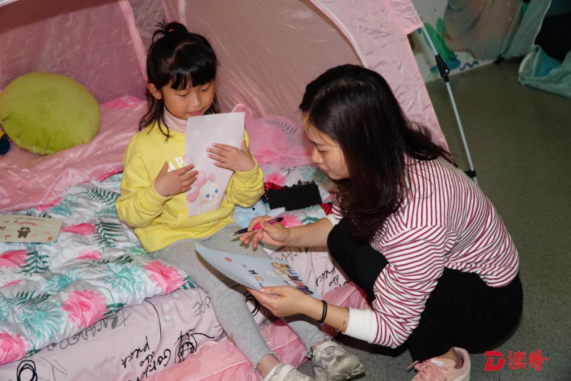經(jīng)過茶歇小憩之后,親子游戲讓孩子們樂不可支,在呼啦圈游戲中東穿西撞,在九宮格游戲中交朋結友,在去哪兒游戲里找不著北……這一晚的熱烈在閱讀推廣人鄧歡姐姐的晚安故事中沉淀下來,靜下心來寫下給未來自己的一封信。帳篷、星燈、繪本、游戲,給這30個親子家庭營造了一個個奇妙的童話夢境。