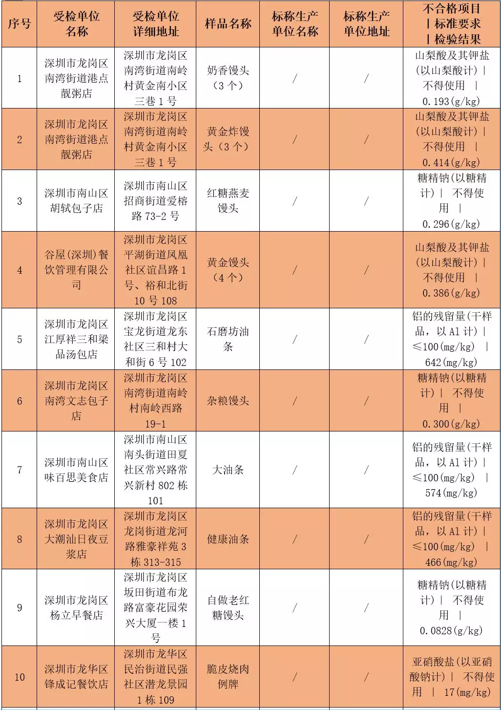 另有2批次油條不合格,不合格項目為鋁的殘留量,分別是: