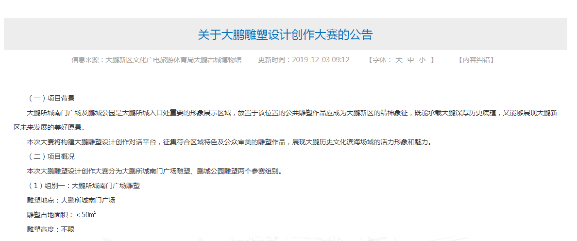 見(jiàn)圳客戶(hù)端·深圳新聞網(wǎng)2019年12月3日訊 為了展現(xiàn)大鵬歷史文化濱海場(chǎng)域的活力形象和魅力,12月3日,大鵬新區(qū)文化廣電旅游體育局大鵬古城博物館啟動(dòng)大鵬雕塑設(shè)計(jì)創(chuàng)作大賽,征集大鵬所城南門(mén)廣場(chǎng)及鵬城公園雕塑作品,參賽不限單位或個(gè)人,最終每組作品都將評(píng)選出6名獲獎(jiǎng)?wù)?,單?xiàng)最高獲4萬(wàn)元獎(jiǎng)金,總獎(jiǎng)金22萬(wàn)元。