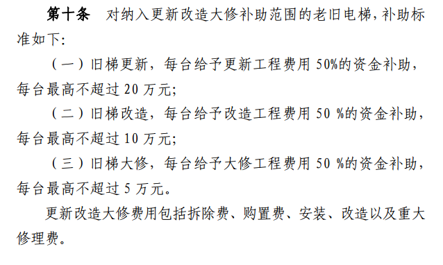 (三)舊梯大修,每臺(tái)給予大修工程費(fèi)用50 %的資金補(bǔ)助,每臺(tái)最高不超過5萬(wàn)元。