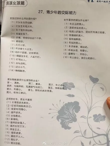 中國新聞網2019年12月6日訊 有網友舉報稱,深圳市龍華區(qū)發(fā)放的《中小學青春期心理生理衛(wèi)生常識手冊》中存在性別歧視等問題,有“這樣的女生,男生不喜歡”,“女生喜歡的男生什么樣?(6):有錢”,“男生不喜歡的女生什么樣?(9):拜金”等種種不當表述。12月5日,深圳市龍華區(qū)教育局回應稱,已立即停止該項目,同時安排收回所有已下發(fā)的資料冊。