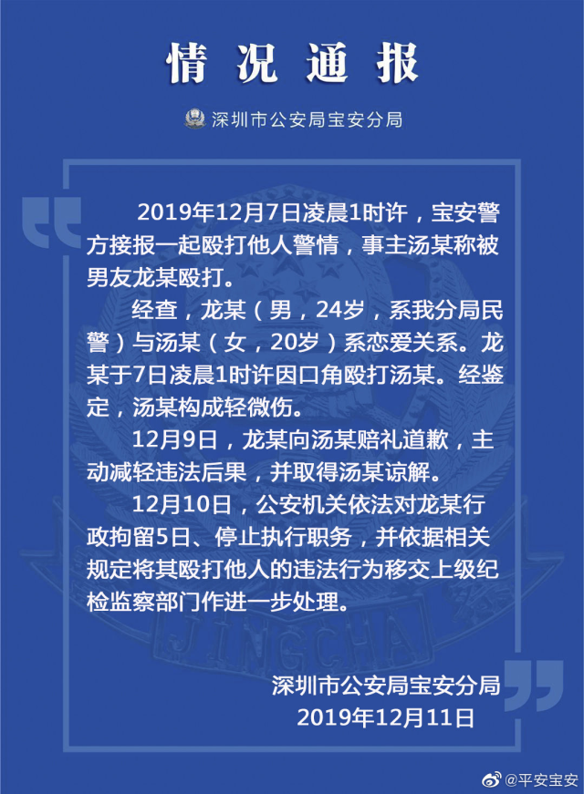 見圳客戶端·深圳新聞網(wǎng)2019年12月12日訊 近日,有媒體報道了深圳女子被男友從家打到樓道,引發(fā)社會廣泛關注。12月11日,深圳市公安局寶安分局發(fā)布通報稱,家暴施暴男子系寶安分局民警,公安機關依法對其行拘5日,停止執(zhí)行職務。