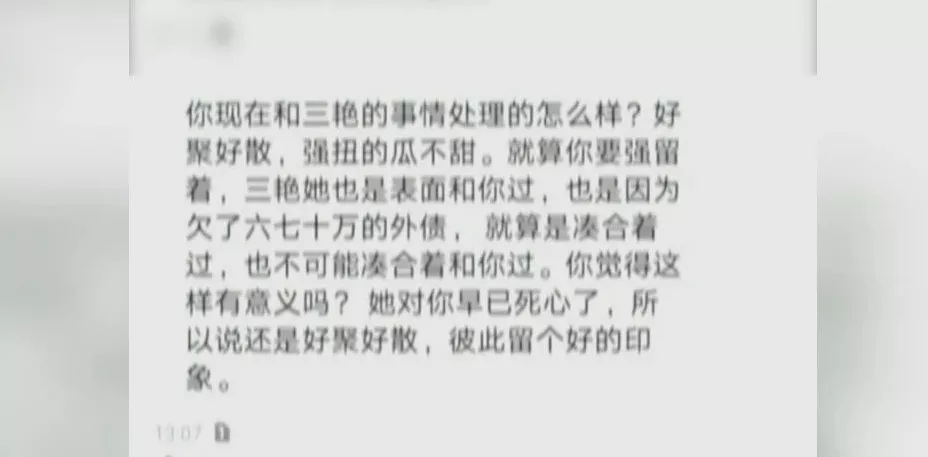 “這個(gè)陌生男的就說,讓我該離婚就離,說她的心已經(jīng)不在我這里了,強(qiáng)扭的瓜不甜什么的。”