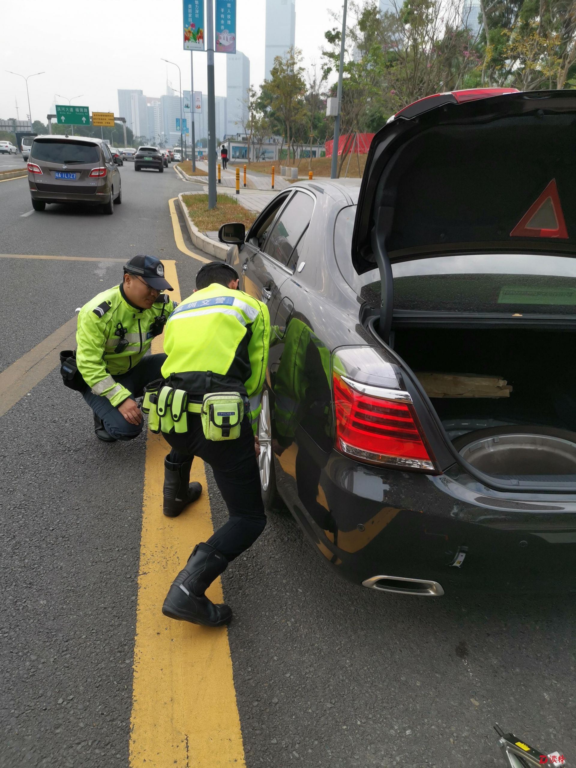 正當(dāng)記者心急如焚且束手無(wú)策之時(shí),在路上巡查的福田交通大隊(duì)香蜜湖中隊(duì)鐵騎鄭彬銳警官途經(jīng)此地,見(jiàn)狀他立即停住鐵騎,上前詢問(wèn)情況。當(dāng)他看到車輛左側(cè)兩輪均癟下時(shí),立即問(wèn)記者是否有備胎,同時(shí)讓記者趕緊聯(lián)系車行再送一個(gè)備胎過(guò)來(lái)。