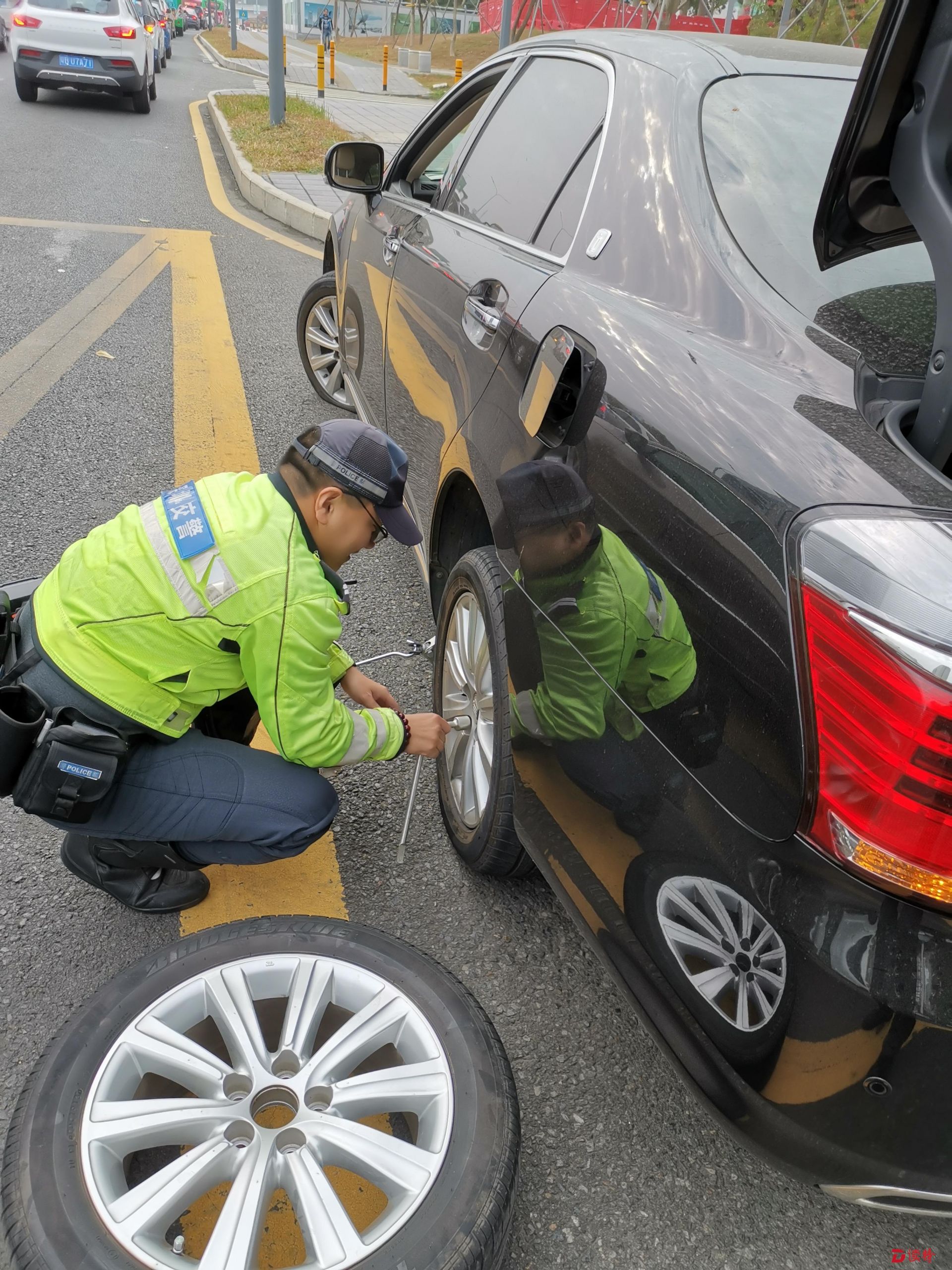 此時(shí),鄭警官和同事滿臉汗水,手上沾滿油污。面對(duì)記者感謝,鄭警官和同事只是說(shuō):“沒(méi)關(guān)系!你再耐心等一下,一定要注意安全!”說(shuō)完,他們又消失在車流中。