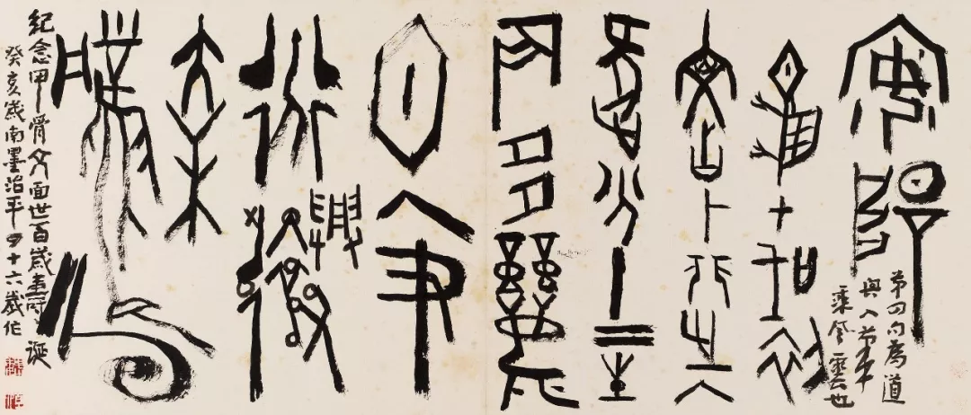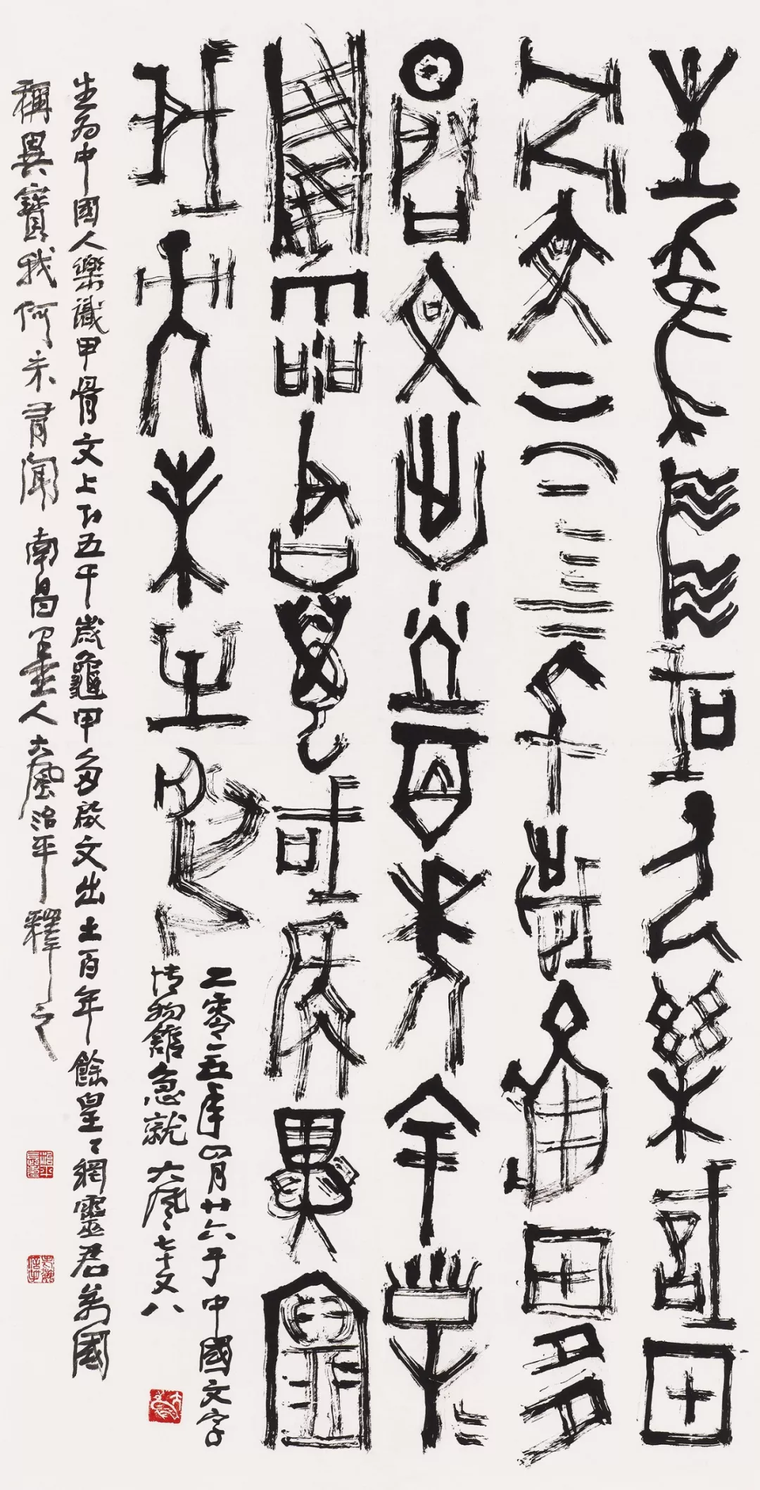 魏治平的甲骨文作品大膽構(gòu)思,探尋先祖造字奧秘。觀其書法,已經(jīng)不僅僅是寫,而是用巧妙的結(jié)構(gòu)、對文字進行解構(gòu),形成一個整體藝術(shù)品。有的字甚至可以根據(jù)其落筆的重點、長短等,唱出古曲。