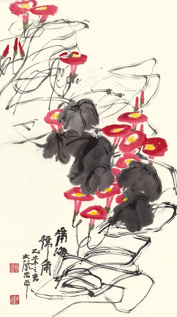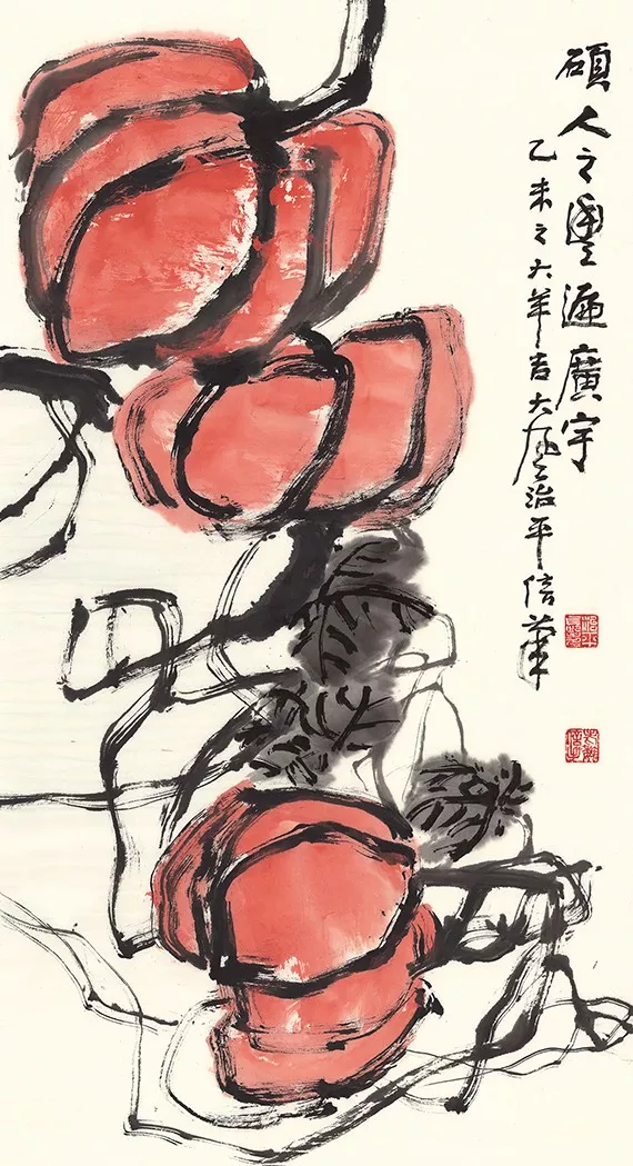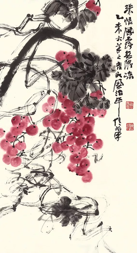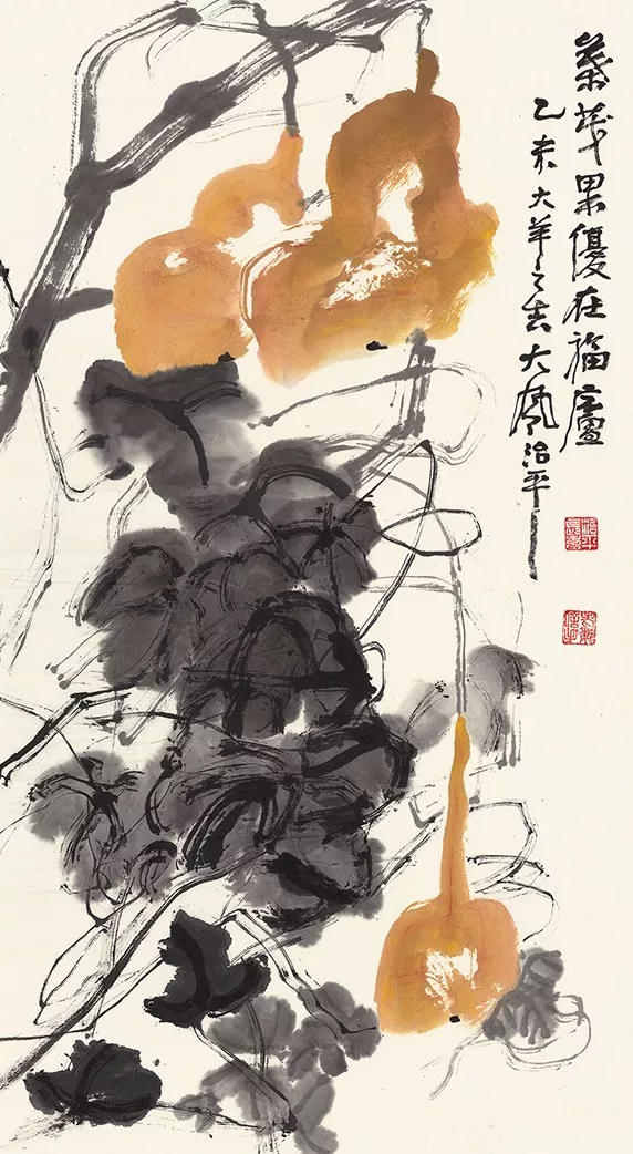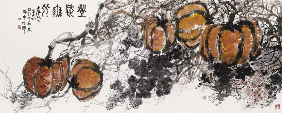魏治平的畫,尤以藤類見長,構(gòu)圖奇異,筆酣墨飽,瓜果菜蔬鳥蟲魚,無一不獨出心裁,氣象崢嶸,水墨淋漓之間極富創(chuàng)作精神,他筆下的南瓜、紫藤、凌霄、葡萄等更有齊白石、吳昌碩之風,自成一派,奔放不離法度,神微孕育氣魄。