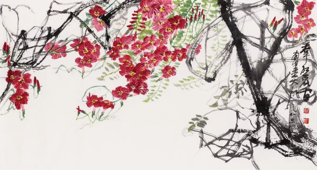 記者在魏治平的工作室看到,他創(chuàng)作的凌霄每一幅都有所不同,不僅畫出了凌霄花的千姿百態(tài),還呈現(xiàn)了凌霄根、藤、葉的獨特風姿。葉茂花紅、根老彌壯、藤連天下,每一幅凌霄都代表了魏治平作為藝術(shù)家對國家的美好祝福。在此次展覽上,觀眾也能看到魏治平最新創(chuàng)作的凌霄。