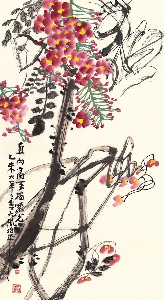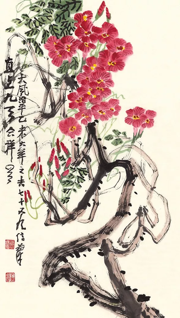 魏治平的藝術(shù)貴于創(chuàng)造,以書法入畫,畫中常見有篆書筆意。三十年前長江日報總編海洋先生,曾提筆寫下《魏瘋子傳奇》,洋洋灑灑八千言,一時間荊楚大地震動。西泠印社理事朱妙根稱其“方寸之間有靈山,紅花墨葉又一派”。西泠印社執(zhí)行社長、中國印學博物館館長劉江先生為其第一本書畫作品集題簽書名。美國前總統(tǒng)老布什收有魏老書法作品“龍蛇競走舞長空、點染梅花分外紅。且賦新詩遙寄意,長江密水兩相通”。印第安納州州立大學博物館大廳懸掛的便是魏老八尺紅梅詩書畫中堂。