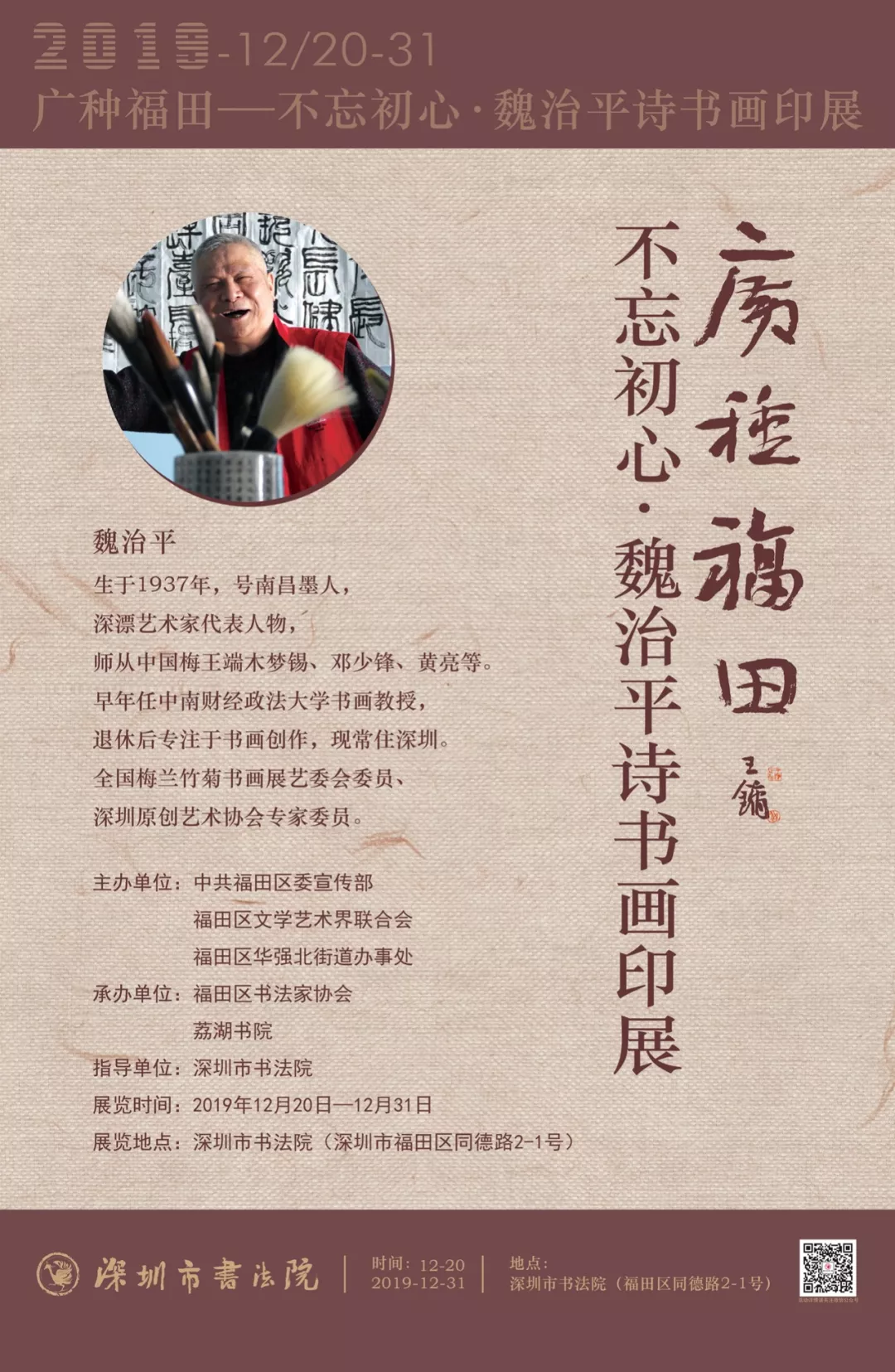 12月20日至12月31日,“廣種福田不忘初心——魏治平詩書畫印展”在深圳市書法院展出。年過八十的魏治平,仍筆耕不輟,堅持攀登藝術(shù)高峰,不斷創(chuàng)作。本次展覽除了展出他多年創(chuàng)作的詩書畫印精品,還會展出他今年的最近佳作。